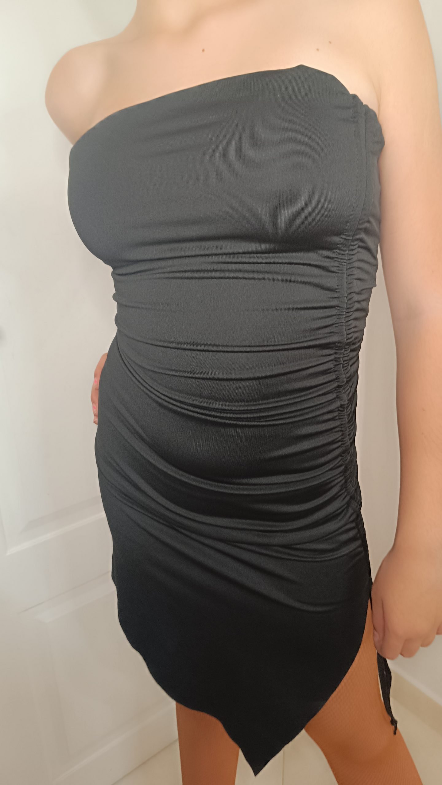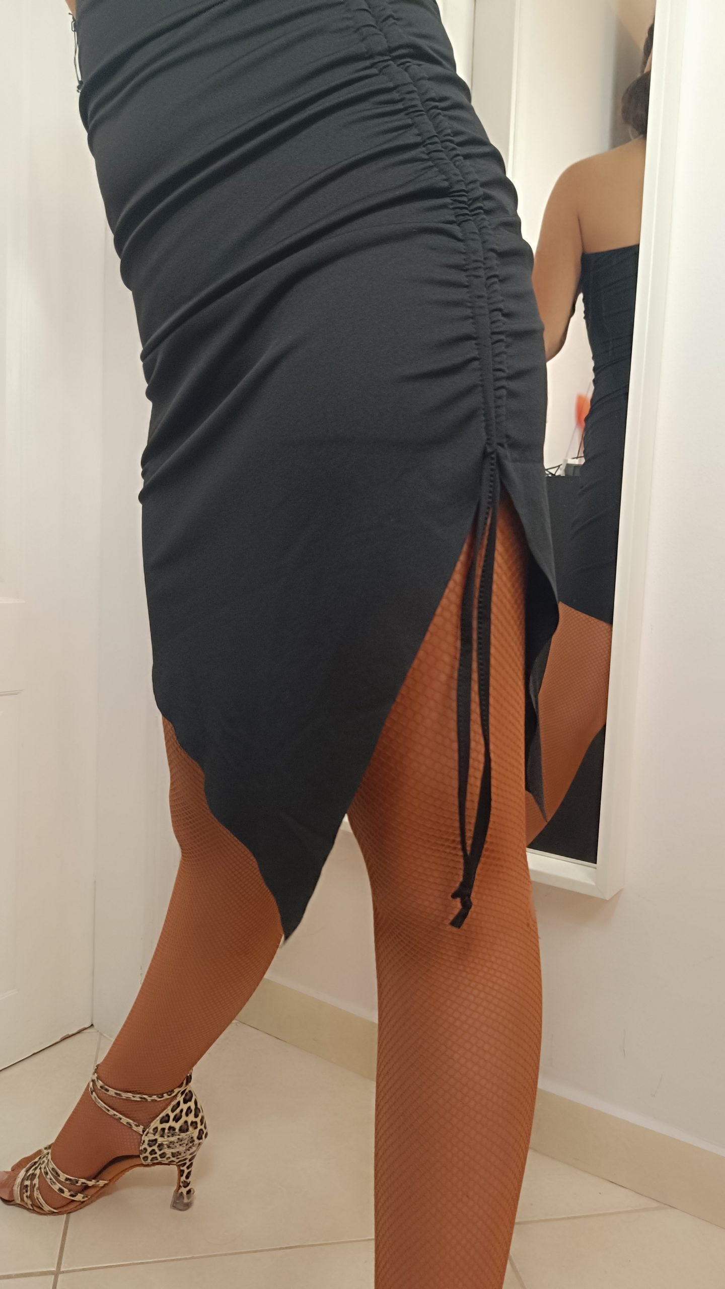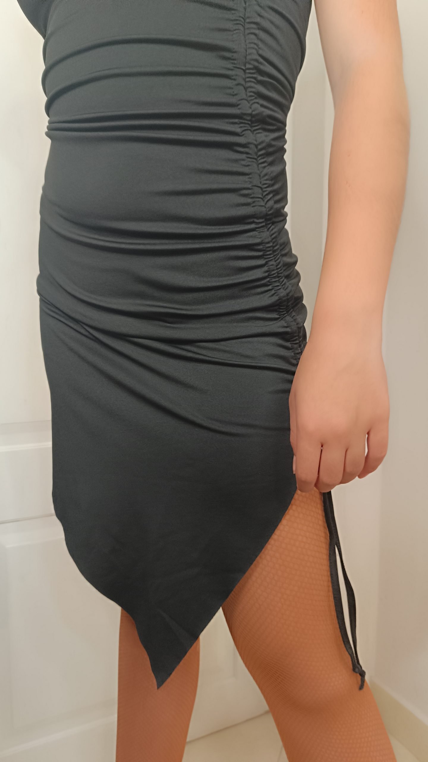Μαύρο ενιαίο φόρεμα με ασύμμετρο κόψιμο και κορδόνια τα οποία σας επιτρέπουν να επιλέξετε το ύψος του σχισίματος στα πόδια, ρυθμίζοντας με αυτό τον τρόπο αν επιθυμείτε μια απόλυτα κομψή ή μια περισσότερο sexy Latin εμφάνιση.