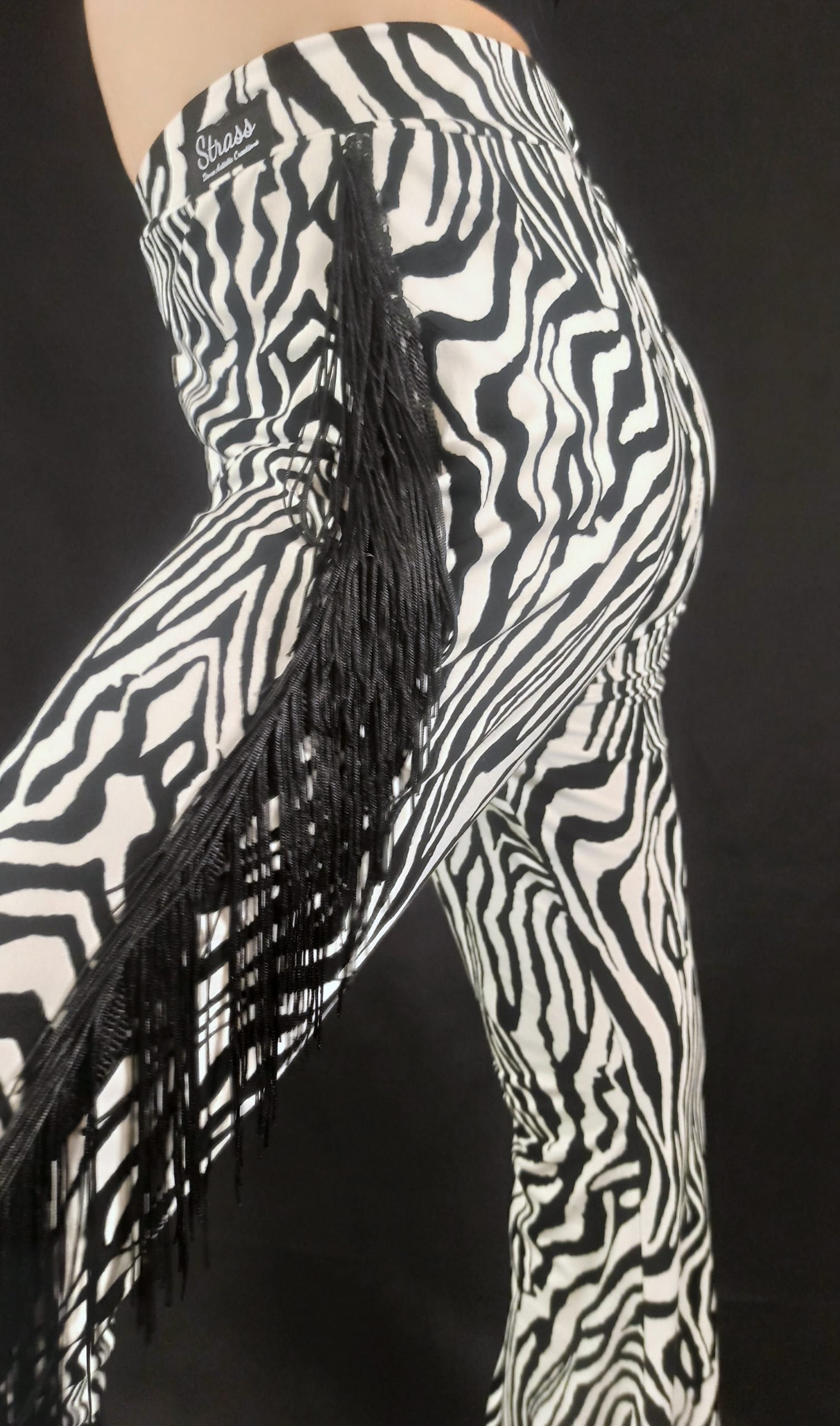 Παντελόνι Animal Print (Zebra) από εξαιρετικά ελαστικό ύφασμα. Διατίθεται και με πλαϊνά κρόσσια για ακόμη εντυπωσιακότερη εμφάνιση.