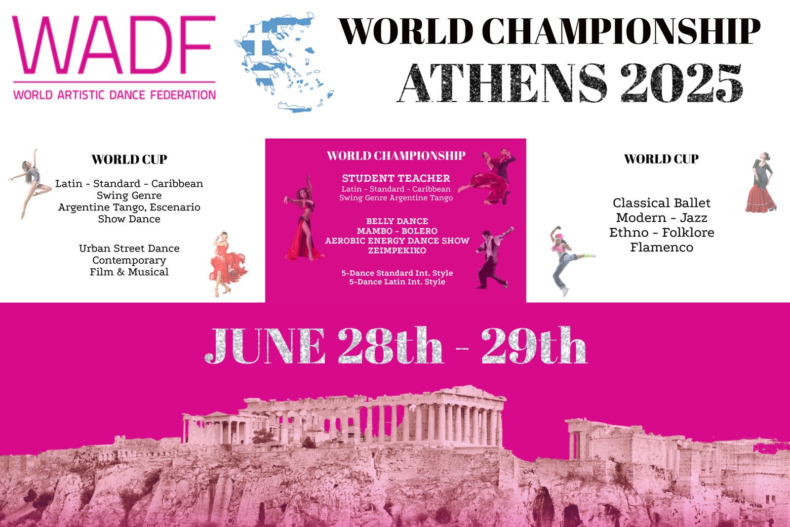 WADF World Championship Athens 2025, presents a prestigious stage for dancers, coaches, and studio owners from around the globe to showcase their talent of their students but also their dedication, and passion for dance. This WADF granted title event celebrates the beauty of movement across all dance styles, providing a comprehensive opportunity for both amateurs of all ages and levels (Beginners – Rising Stars) and professional dancers to compete on an international stage for top honors.